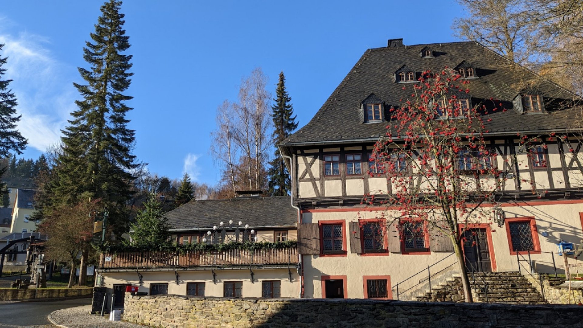 Experiencia fantástica: Frohnauer Hammer, eso ya es una experiencia y es uno de los componentes más significativos del 'Patrimonio de la Humanidad' de la UNESCO. Un recorrido guiado por el museo lleva a los visitantes a través de tres casas: 1. Antiguo taller de herrería con colección de producción, aquí se puede conocer de cerca la antigua técnica de forjado de hierro del siglo XVII. Mediante dos ruedas de agua se muestran en funcionamiento el martillo pequeño y los dos fuelles. En dos habitaciones en la planta alta del taller se puede obtener información sobre la producción del martillo. 2. Galería de arte popular, aquí se obtiene una visión de la creación artística del pueblo de la parte superior de Erzgebirge. Además de una gran montaña natal con temática minera, la exposición se dedica especialmente al arte popular del tallado. 3. Casa del señor del martillo con sala de encaje, al final se entra en la casa del señor construida en 1697. En la primera planta se conservan las habitaciones de la última familia de maestros herreros, los Martin, del siglo XIX. Una encajera explica y muestra la técnica tradicional del encaje de bolillos de Erzgebirge. ¡Hay tanto que ver y experimentar!