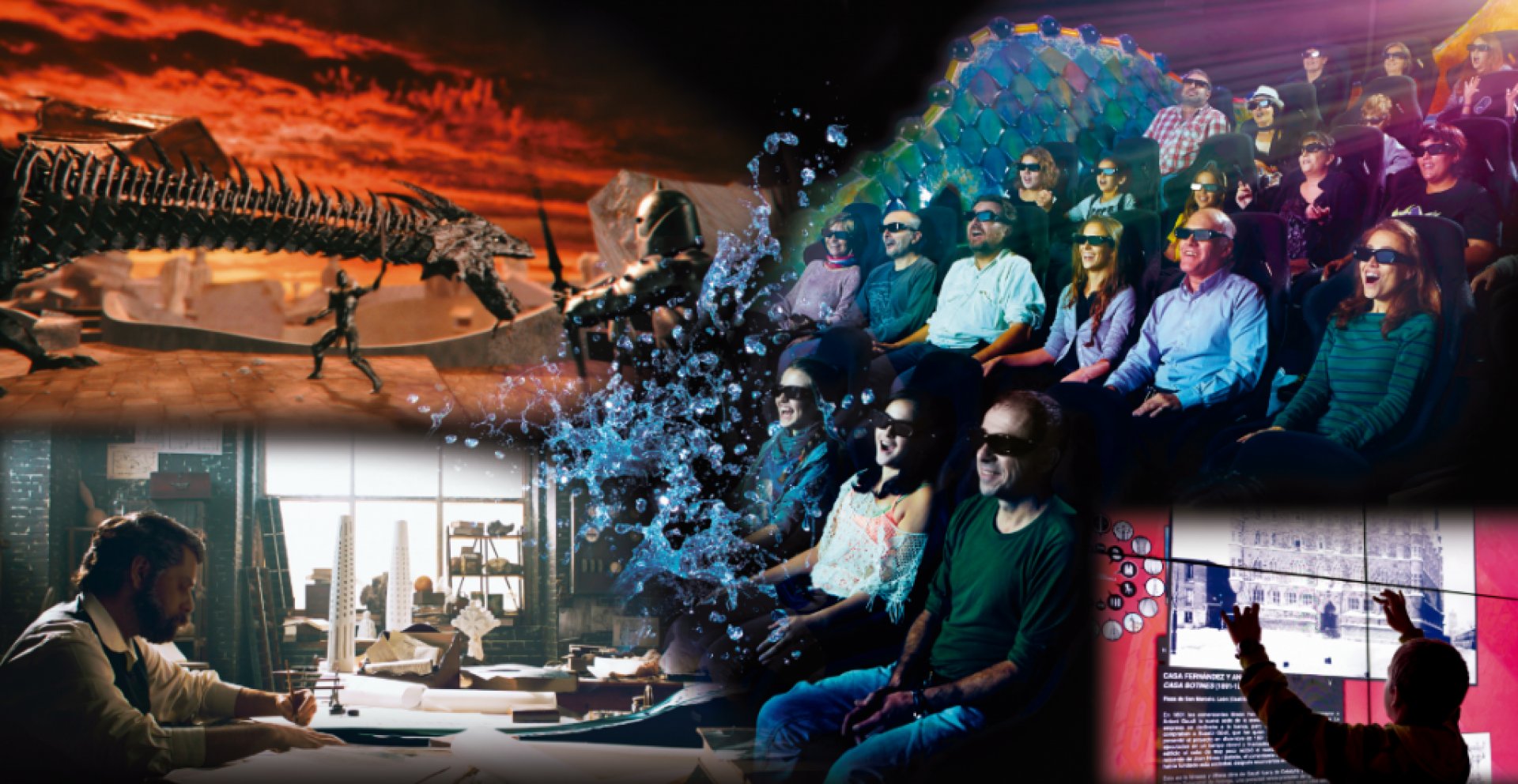 Efectivamente, la visita se desarrolla en dos espacios diferenciados: la sala de audiovisuales, donde se proyectan las experiencias en 4D y RA, y el espacio interactivo, de libre acceso, en el que se encuentran grandes pantallas táctiles con información sobre la obra de Gaudí en 9 idiomas, maquetas inéditas y zona de juegos.