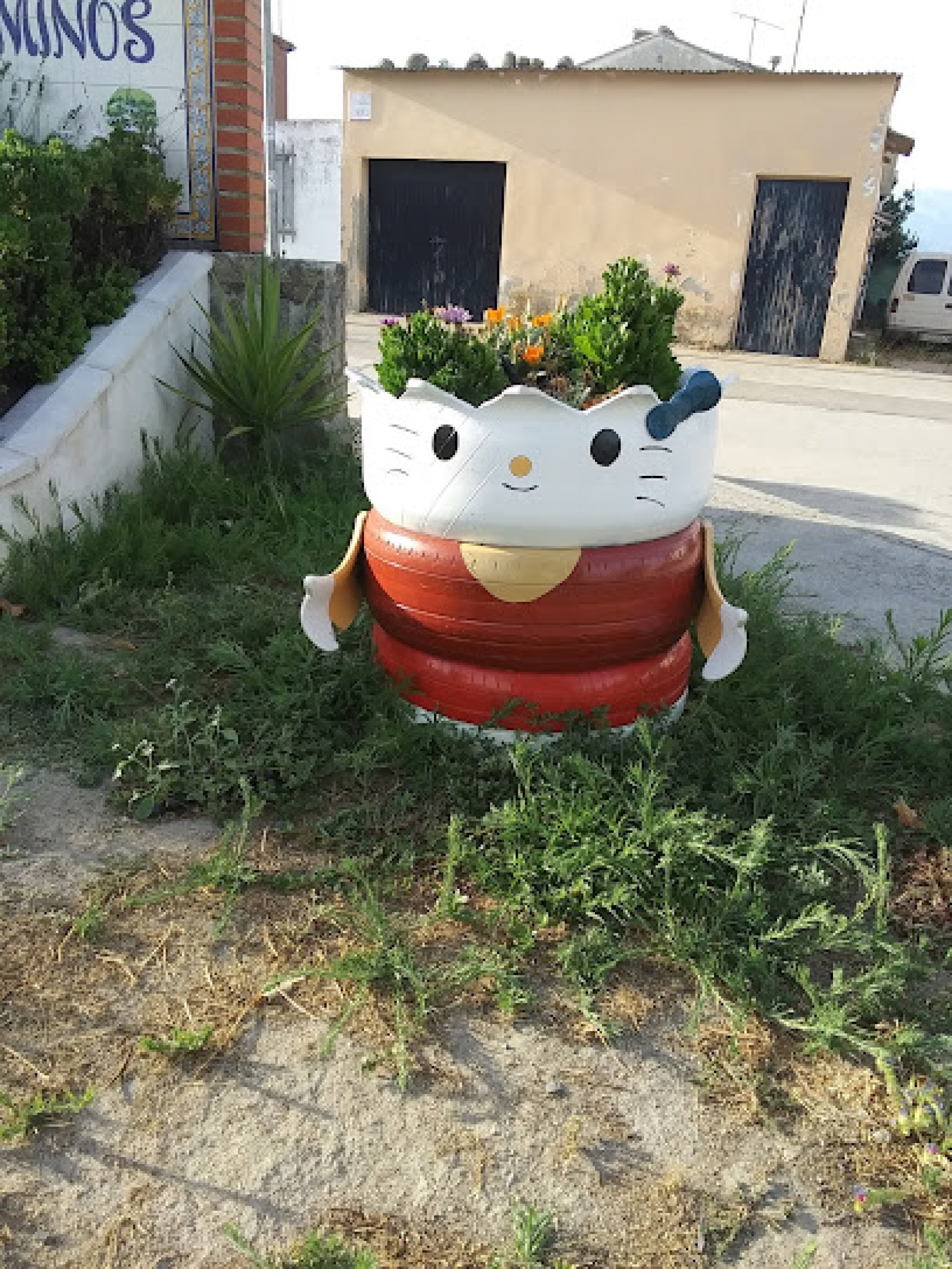 Experiencia fantástica: Hay. Figuras de dibujos animados hechos con neumaticos. reciclados Los miniuns. Helou kiti. Helou Mimi. un gatonejo. tortugas. una araña. un pozo. floreros y un coche