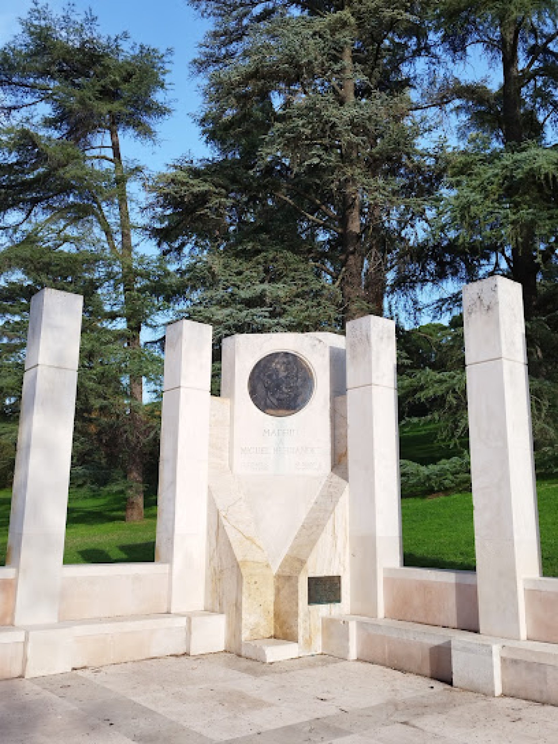 Experiencia positiva: Monumento en homenaje al poeta alicantino Miguel Hernández obra del arquitecto Enrique Dominguez Uceta. Destaca un medallón en bronce, realizado por el escultor Miguel Ángel López Calleja, con la cara del poeta que es una reproducción del retrato que le hizo Antonio Buero Vallejo en 1940, cuando estuvieron encarcelados juntos. "MADRID... esta ciudad no se aplaca con fuego, este laurel con rencor no se tala. Este rosal sin ventura, este espliego... júbilo exhala" Miguel Hernández Miguel Hernández escribió un precioso poema dedicado a Federico García Lorca, tras la muerte del poeta granadino, con el que había tenido una lucha de egos: "Qué sencilla es la muerte qué sencilla pero qué injustamente arrebatada. No sabe andar despacio y acuchilla cuando menos se espera su turbia cuchillada" Miguel Hernández