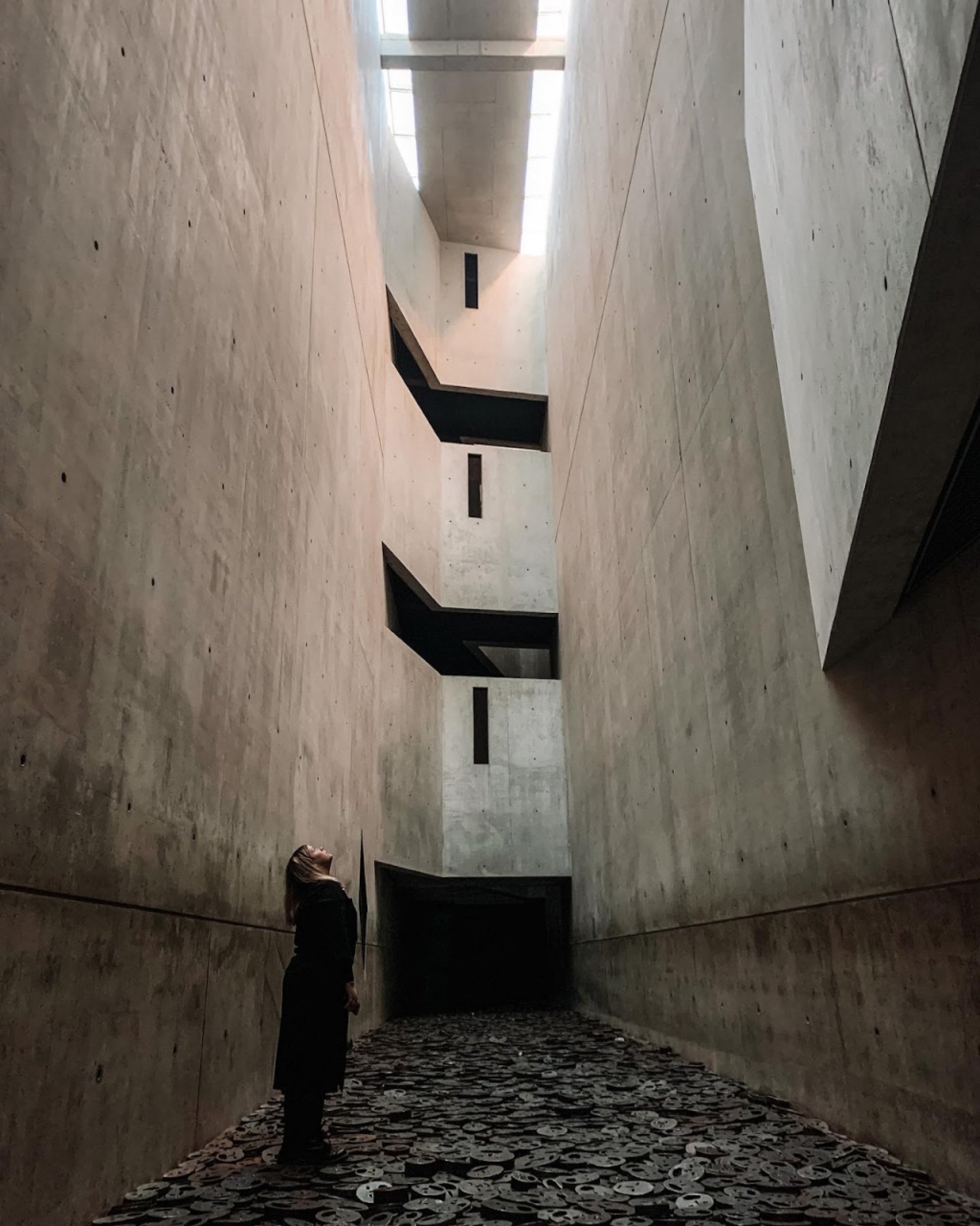Experiencia fantástica: Al entrar en el interior del museo judío, uno se siente incómodo. La disposición no convencional de las líneas - la perspectiva del pasillo, la desalineación de las ventanas en las paredes y el techo, la inclinación del suelo, la asimetría de la iluminación del techo... la mayoría de las líneas visibles están dispuestas de manera que resultan incómodas a la vista y las paredes y el suelo están diseñados para ser incómodos al tacto. Al llegar al fondo, donde se pisa un disco que tiene la apariencia de rostros humanos crujientes, esa incomodidad (?) alcanza su punto máximo. Quizás se desee que el visitante sienta corporalmente esa incomodidad de aquel evento, el sufrimiento de quienes padecieron la injusta masacre.