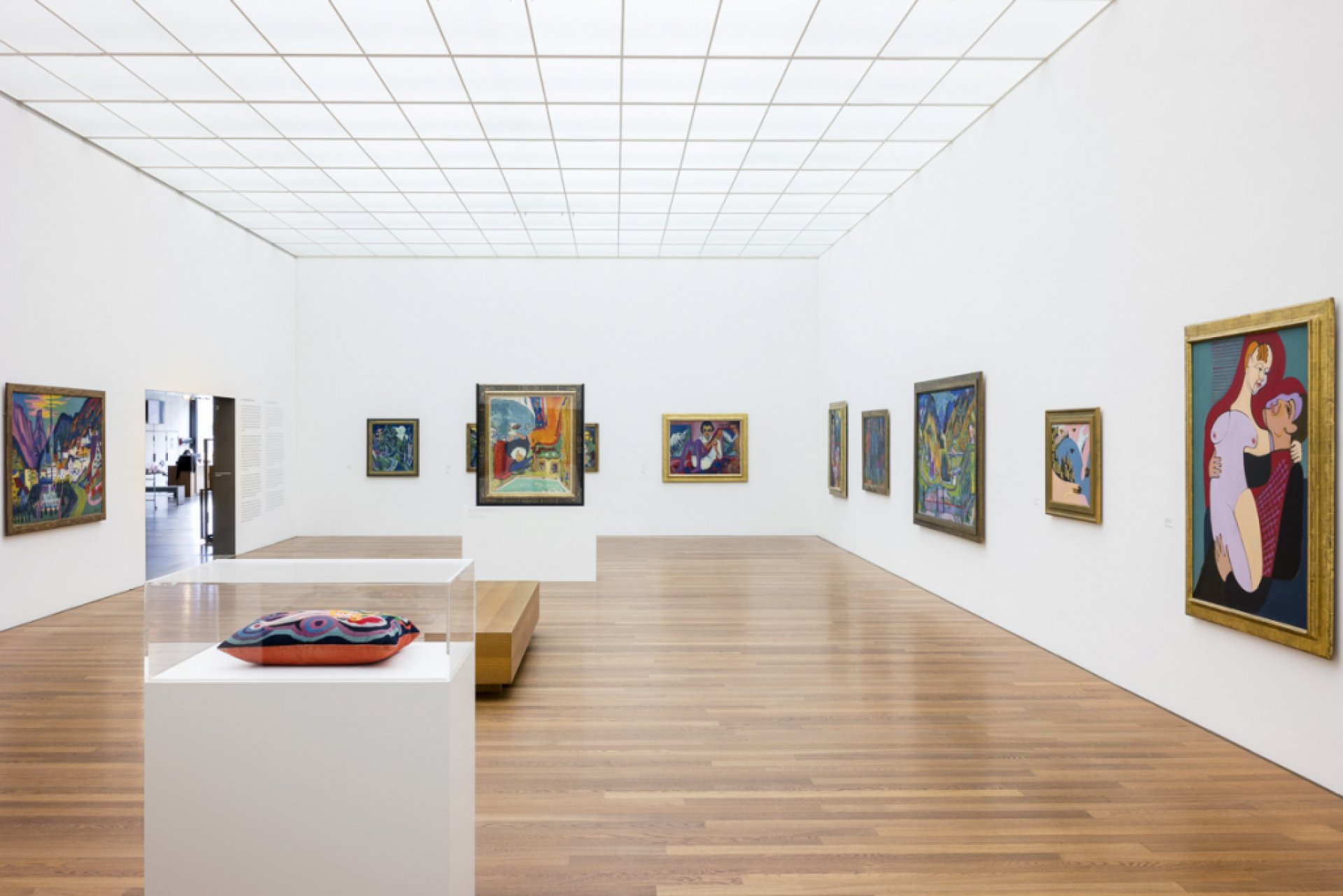 Museo tipo galería que exhibe obras de Ernst Ludwig Kirchner en un moderno edificio de cristal.